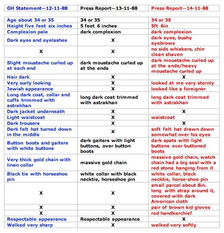 Another story now discredited is that of the man Hutchinson, who said that on Friday morning last he saw Kelly with a dark-complexioned, middle-aged, foreign-looking, bushy-eyebrowed gentleman, with the dark moustache turned up at the ends, who wore the soft felt hat, the long dark coat, trimmed with astrachan, the black necktie, with horseshoe pin, and the button boots, and displayed a massive gold watch-chain, with large seal and a red stone attached.