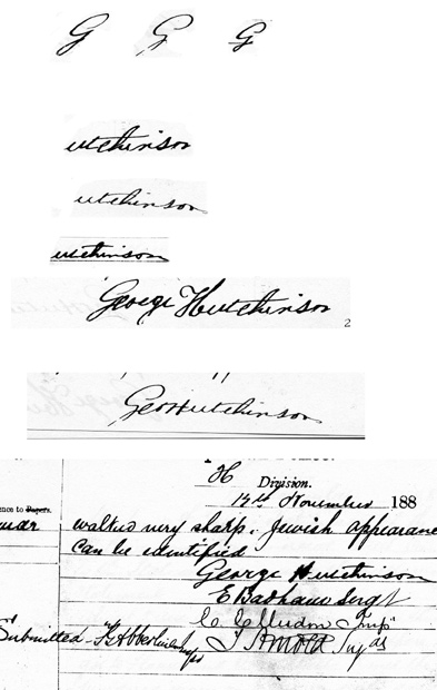 The statement was written out, presumably by Badham and then given to GH to sign. Either Hutchinson read the statement or it was read to him, either way after reading the sheets were passed to GH for signing. He is not comfortable with a pen and ink so in his first signature he tries to emulate the capital H he sees at the top of the sheet next to Division. The result is a hesitant; you can see where he hesitates at the bottom of the first part of the letter before going left, unformed letter. Because it is not his style of writing you can see that when he finishes the letter H he doesnt know what to do next. His pen starts to go up, and then he thinks better of it and it loops around anticlockwise before forming the U. The result is a squiggle that looks like the letter e.