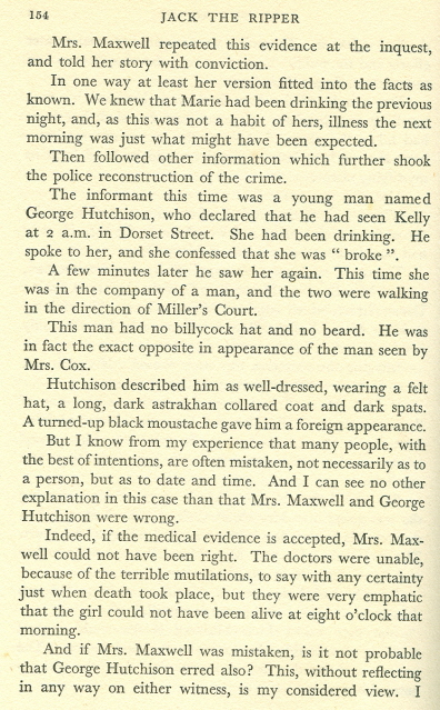 The trouble with Dew is that he offered his own personal speculations regarding Hutchinson, rather than the collective wisdom of the contemporary police. It certainly was not established at the time that Hutchinson was “honestly mistaken”, or else he’d have said so, rather than appealing to his readers to accept his musings as to what he regards as “probable”. He was evidently impressed with the 1.00am time of death and the theory that the blotchy-faced man was the murderer.