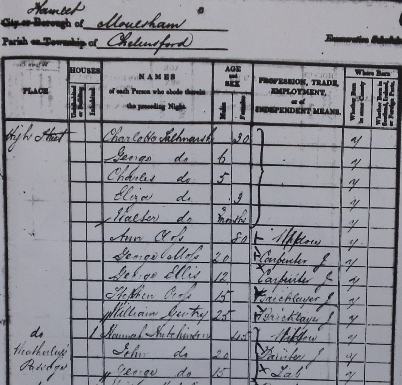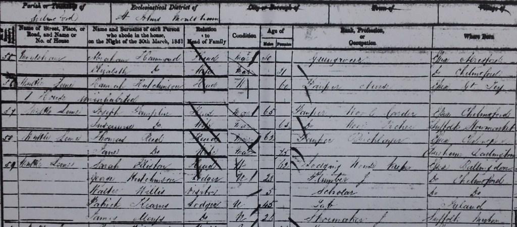 It is interestingly that his mother Hannah Hutchinson is listed a few entries above, also on Writtle Lane, as a pauper aged 60. She is listed as having been born at Great Tey, which is near Colchester in Essex.
