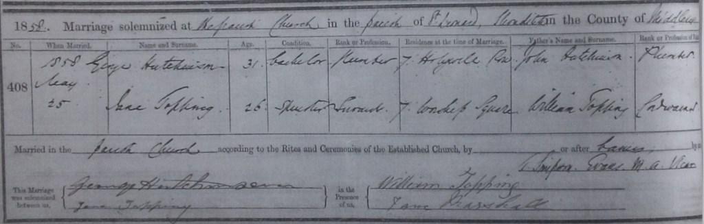Remember that in the 1871 census the family lived in St Luke’s, Norwood – George and Jane Hutchinson, their son George (again no Topping, aged 4, born in Surrey) and daughter Jane (aged 10, born in Hornchurch, Essex).