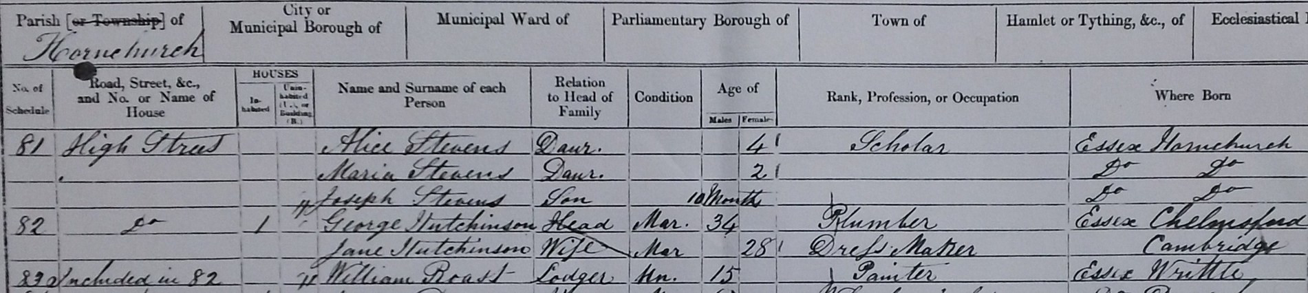 Unfortunately it is not clear what the street number was, but living in their house was a 15 year old lodger called William Roast, a painter from Writtle in Essex. Writtle is a suburb of Chelmsford, lying just to the west of that town. It is possible that he was known to George Hutchinson via the Chelmsford connection.