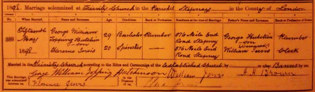They gave their address as 576 Mile End Road, but they are not listed at that address in either the 1898 or 1899 electoral register – the same seemingly unconnected person was there on both these dates.