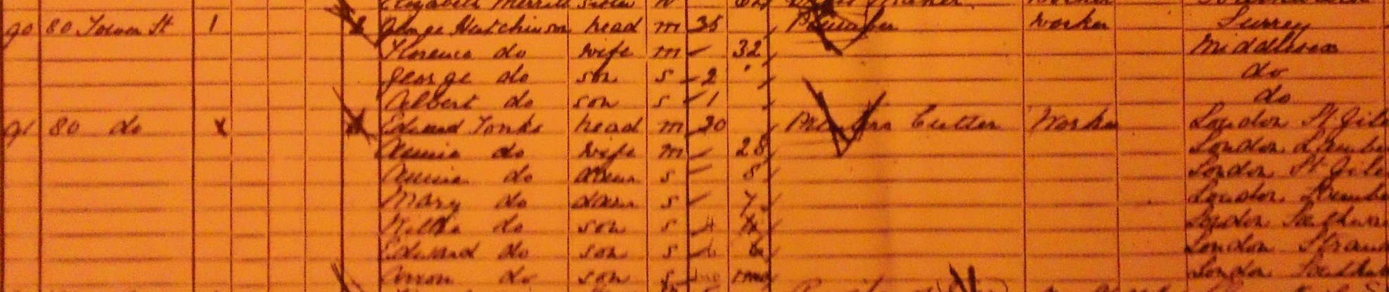 He is listed as George Hutchinson, married and head of the household, aged 35, a plumber employed by someone else (i.e. not self employed), born in Surrey.