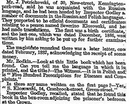 I think Sam was quite correct to point out that the in-court discussions of Klosowski's copy of 500 Prescriptions failed to provide us with any context by which we might place his residency at Cranbrook Street firmly into the timeline, except to say that it preceded his adoption of the Chapman alias. I attach the account which the Times published on 22 January 1903: