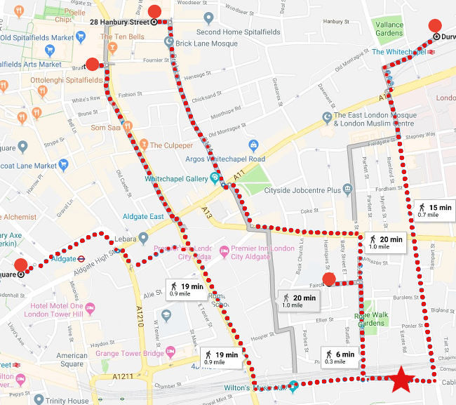 To give us an idea of what this implies, here's a quick and dirty Google Maps view of the canonical murder sites and their relationship to 126 Cable Street (red star at bottom right), together with approximate walking times. In only one case, that of Liz Stride, was he within a truly short distance of a murder: