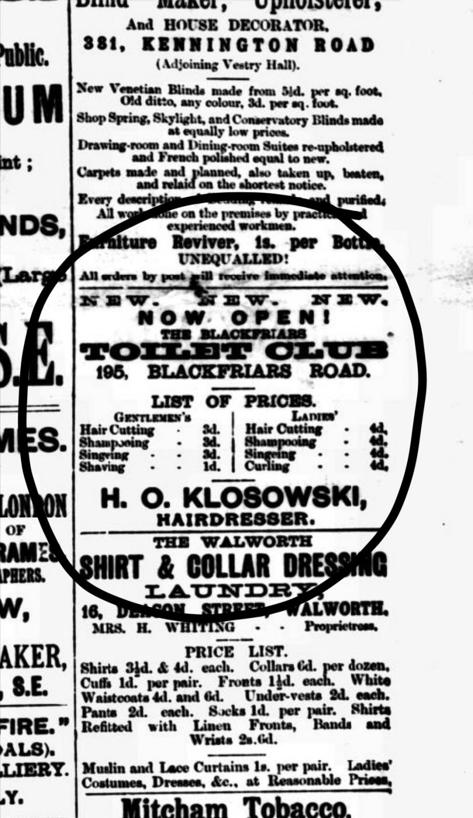 I found a reoccurring advert in the South London Chronicle advertising a hairdresser with the surname Klosowski from September to November 1887 in London. Klosowski seems to be quite a unique surname and the occupation and timing fit and we know SK was fond of aliases.