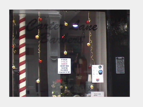 3."Free Beer" sign in the Carter Lane ,Barber Shop window.
