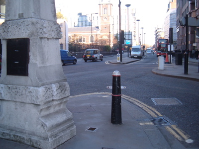 3. The historic Aldgate Pump,looking at Aldgate and St Botolphs in distance-which is at the bottom of Houndsditch.The Aldgate pump itself marks the junction of Leadenhall Street ,Fenchurch Street and Aldgate and takes in Mitre Street -between taxi and blue car on mid left of picture-Mitre Street leads to Mitre Square.Picture is taken looking East .