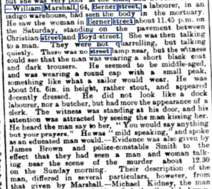 A labourer living at 64 Berner Street who testified to seeing a woman he later recognised in the mortuary as Elizabeth Stride standing about three doors away from his house at about 11.45pm, 29th September 1888. She was apparently on the pavement opposite No.68, between Christian Street and Boyd Street and was with a man; the couple were talking quietly. Because there was no lamp nearby, Marshall could not see the man's face clearly, but was able to furnish the inquest with other particulars - he was middle-aged and stout, about 5ft 6in tall, respectably dressed in a small black cut-away coat and dark trousers. He was wearing a small peaked cap, "something like a sailor would wear". He had the appearance of a clerk. The woman was wearing a black jacket and skirt and a black crape bonnet, but did not see the flower that was pinned to the jacket.