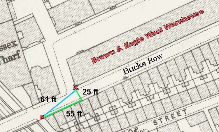 Ah goody, pleased you have posted that. You do know, using simple Pythagoras Theory that the Wool Warehouse is 61 feet away from where Polly lay. SO if he crossed the road on that diagonal, I'm presuming most would, then at the middle of the road he was 30 feet or 10 yards away from the body when he heard Robert Paul and turned back to go towards him.
