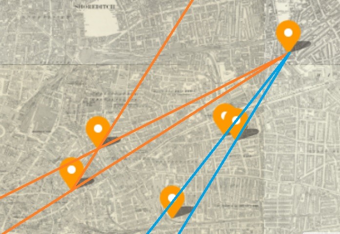Ok, I've marked the two outer corners of the block around St. Phillips this time, as it gets too crowded otherwise, and also the other markers would place lines inside the angle anyway. Looks messy if I add the lines starting at Pinchin Street, but as the Church is roughly 1/2 way between the two locations, it would be a similar "cone" pointing the other way.