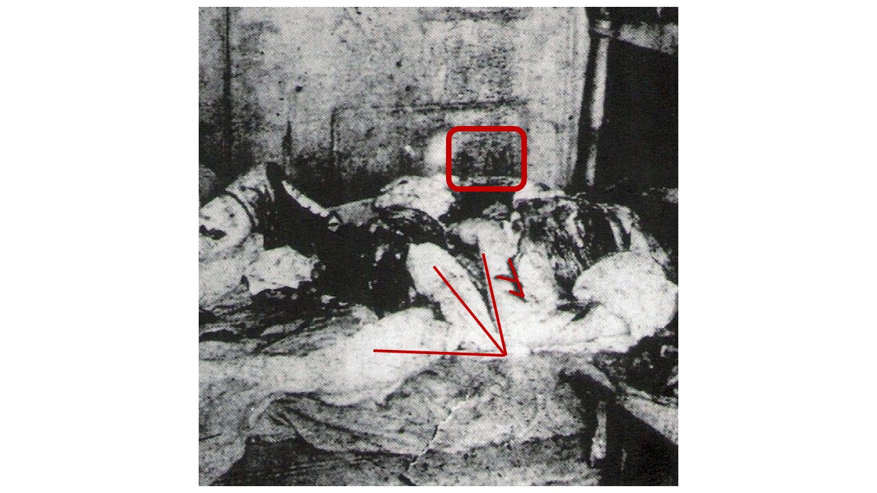Im certain I know which marks you are referring to, but I absolutely do not agree that they are an 'F carved into her arm''. If there was a slight possibility that the marks you are seeing were a letter of any description, I just cannot accept that they went unnoticed by every contemporary.