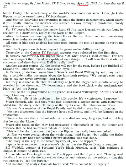 As most people know I do not like to get involved in debates about the 'diary'. In 1993/4 I was involved in the emergence of this highly dubious artifact and witnessed a lot of what 'went on', spending quite a bit of time at Paul Feldman's office.
