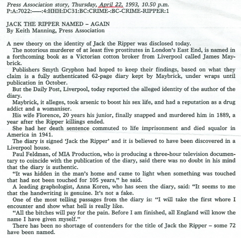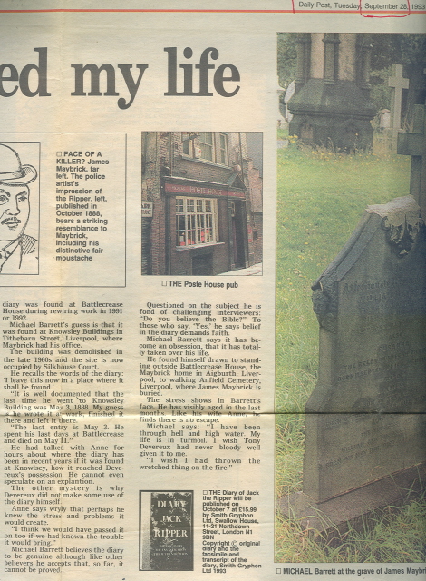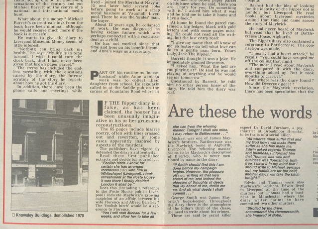 I am perceived as an arch 'anti-diary' person, though, as those who know me should know, I merely believe that honesty should be at the forefront of Ripper research and this was a quality that was noticeable by its absence in many aspects of the promotion of the 'diary' which was exploited as a money-making exercise. There can be no doubt that it raised a huge amount of interest in the subject.