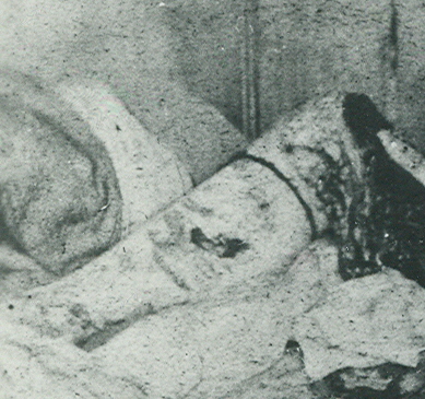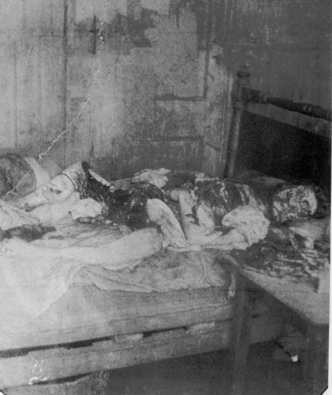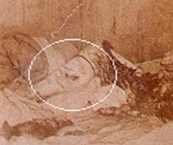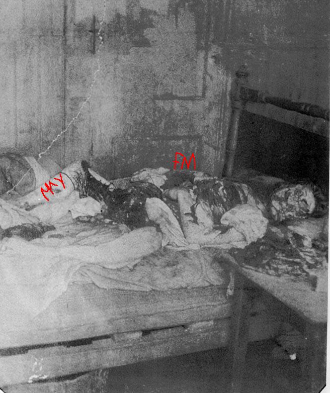 Re the M V that I can see, I looks to me like smudges made by bloody fingers moving or touching the leg rather than anything deliberate. Which of course would have been a possible boon if fingerprinting had been an option.