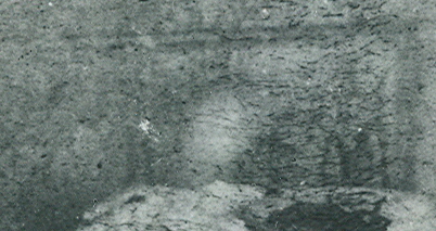 Both are affected by the grain of the photographic paper and their obvious age. The former image is the one on which a letter 'M' appears discernable, although under magnification the true nature of the marks is more apparent and appears more like random splashing on the partition as opposed to a deliberate letter. The the bottom part of the alleged letters disappear behind the corner of the mattress.SPE