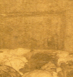 The second photo (in sepia) is that anonymously returned to New Scotland Yard, in the photograph album, in 1988. Since its return it suffered damage diagonally across the left upper side of the photograph. It is the one used by Paul Feldman which he had copied. It, too, has now appeared in several books, usually in black and white. Reproduced below is the relevant area of the two photographs, the first the one found by Don Rumbelow and the second the one returned in 1988 -