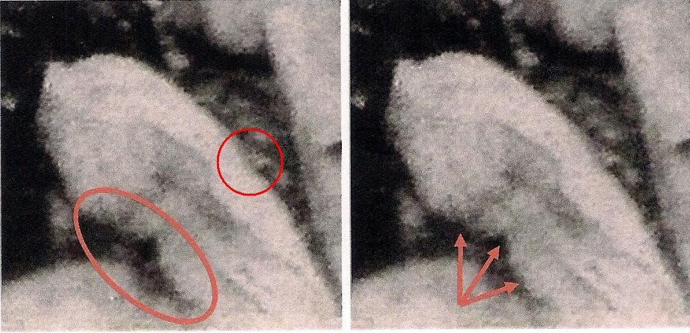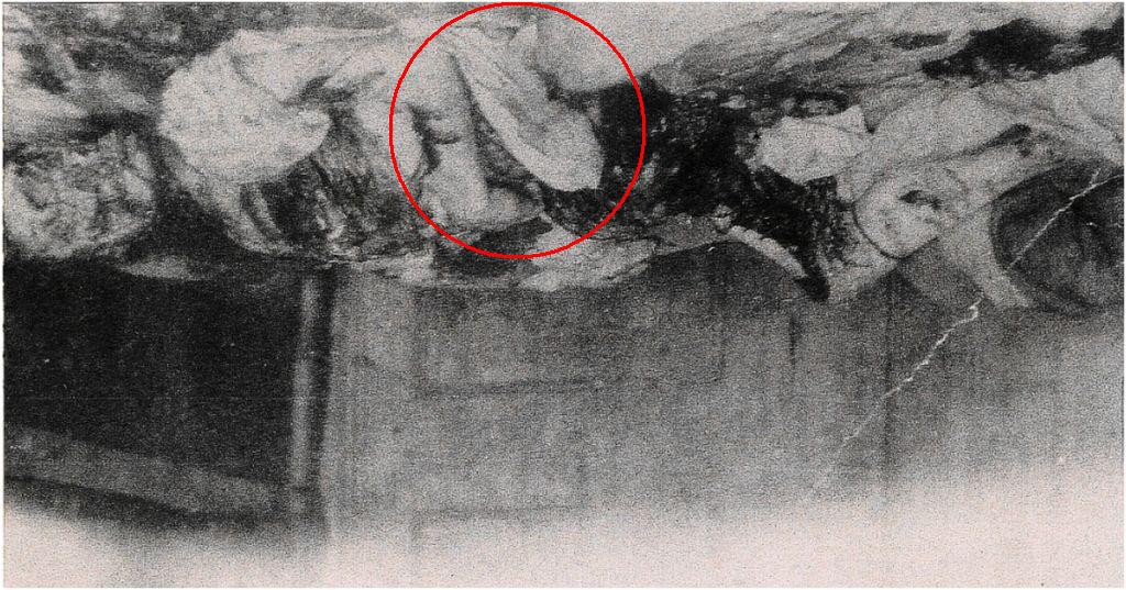 Below are several enlarged versions of the Chemise (sorry about the quality - it’s infrared film). If we look at the left side of the material we will notice that there is an odd semi-circular depression pushed in to it (circled). This was made when the fingers of the killer’s right hand scrunched up the material as he was moulding it into the shape he required. We can tell it was the right hand because, on the right side, we have a smaller indentation that corresponds with the thumb of the right hand (circled). Another thing to notice about this large semi-circle is that we have several smaller depressions within it (arrowed). The middle finger of the right hand made the larger of these depressions. I know this because I’ve tried it, and it works.