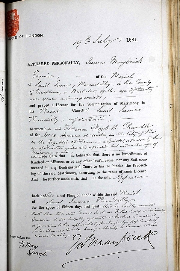 Appeared personally, James Maybrick, Esquire, of the Parish of Saint James, Piccadilly, in the County of Middlesex, a Bachelor, of the age of twenty one years and upwards, and prayed a Licence for the Solemnization of Matrimony in the Parish Church of Saint James, Piccadilly, aforesaid, between him and Florence Elizabeth Chandler of No. 18 Avenue d'Antin, in the City of Paris, in the Republic of France, a Spinster, a Minor of the age of Nineteen years and upwards but under the age of twenty one years, and made oath that he believeth that there is no impediment of Kindred or Alliance, or of any other lawful cause, nor any Suit commenced in any Ecclesiastical Court to bar or hinder the Proceedings of the said Matrimony, according to the tenor of such Licence. And he further made oath, that the said Appearer hath had his usual place of abode within the said Parish of Saint James, Piccadilly, for the space of Fifteen days last, and he lastly made oath that the said Minor hath no Father living or Testamentary Guardian to her lawfully appointed or Mother unmarried or Guardian to her appointed by Her Majesty's High Court of Justice, Chancery Division, having authority to Consent to such intended Marriage.