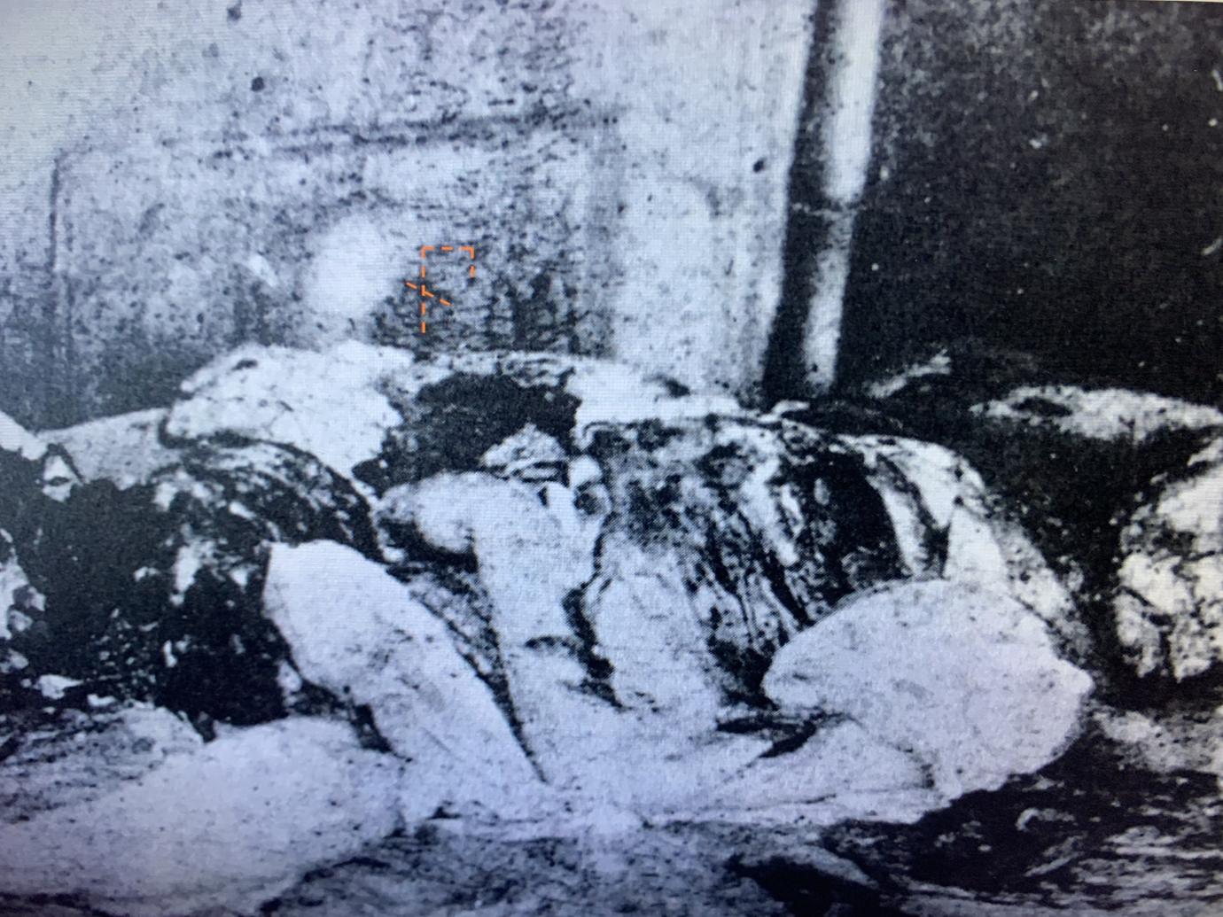 Still can't see the F though. And in the M (the right hand arch) I can see a 2 as well (the bottom is "looped", so like a 2 done in cursive script type thing). To me the "M" looks like blood spurting twice, like two consecutive heart beats after her throat was cut spraying blood on the wall. The position relative to the edge of the bed fits with that in my opinion as well as it's right beside where someone's neck would be if they were laying on the bed on that side. It doesn't look like someone "wrote" it, nor is it in a location that I would expect to be. I would think writing would be higher on the wall as the writer would be on the bed, probably kneeling, so the most natural place for "writing" to be would be above the bed at roughly shoulder height based upon someone on their knees. But, that's just what it looks like to me, I'm sure it looks different to you, but that's the nature of perception.