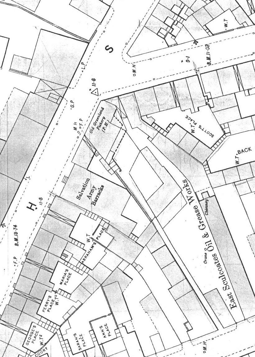 Next up is a fairly recent ordnance survey map from the 1980's. The mill has now gone, but the Tallow factory remains, now listed as "Works"