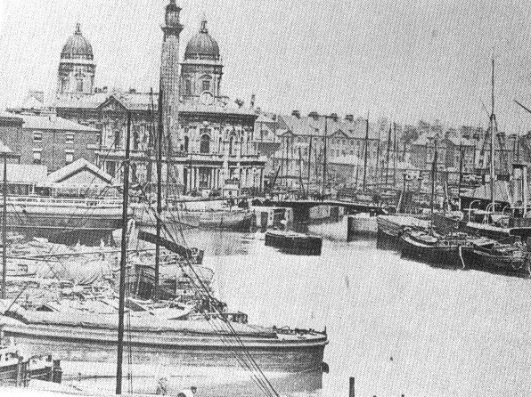 Right, here is a shot taken from the Dock Offices, now home to the Hull Maritime Museum, looking over the former Queen's Dock, now the Queens Gardens, and a during the early 1800's "The Old Dock".