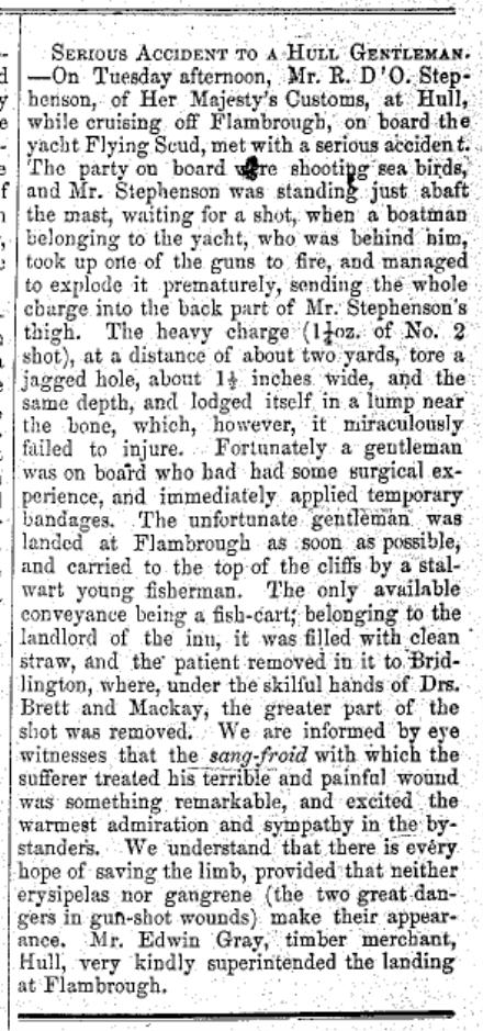 On Tuesday afternoon last Mr. R.D.O. Stephenson of Her Majesty’s Customs at this port, while cruising off Flamborough, on board the yacht Flying Scud, met with a serious accident. The party on board were shooting seabirds and Mr. Stephenson was standing just abaft the mast, waiting for a shot when a boatman belonging to the yacht, who was behind him, took up one of the guns to fire and managed to explode prematurely, sending the whole charge into the back part of Mr. Stephenson’s thigh.