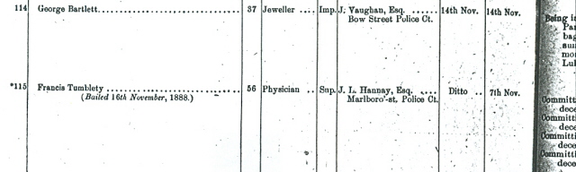 As Stewart Evans contended, the procedure was to have a warrant issued and to have the person rearrested on the same charges prior to the hearing. The police magistrate’s court issued the warrant for Tumblety on November 14th. Tumblety was to return to the police station on that day and surrender his police bail. He would have then been held until the hearing on November 16th. At the hearing, the magistrate found that there was sufficient evidence to prosecute and set a trial date at the Queen’s Bench. At the same time, Tumblety was granted bail on the warrant by which he was arrested.