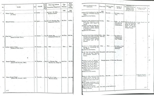 The argument that I was offering was based on the evidence of the report in the New York Daily Tribune (see post #15 above) where it was stated that Tumblety was arrested as a suspect for the Whitechapel crimes but released for lack of evidence. My contention being that this initial arrest and release occurred on 7th and 8th November. The Tribune report goes on to say that he was rearrested on another charge. My contention here is that a warrent was obtained on 14th November (as shown on the court calendar) and he was then arrested and taken before the court on 16th November. So the evidence supporting this argument is the Tribune report (which admittedly could be argued to be inaccurate) and the issue of the warrant on 14th November as shown on the court calendar. The court calendar (as I pointed out) was a retrospective document printed at the end of December (after Tumblety got back to the USA) and therefore the column entries give final results. So although the gross indecency offences are shown in the next column to the 'When received into Custody' column they do not necessarily show the reason for the initial arrest as the offences column is headed 'Offence as charged in the Indictment' which are the offences the offender was finally charged with for court. Below is the whole double-page entry of the court calendar book.