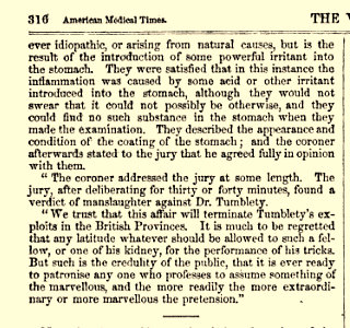 This article incorporates a previous article from the BMJ, Montreal which gives specifics about Tumblety's Manslaughter case- Tumblety was charged with Manslaughter for causing the death of a British man who took one of his health remedies. The heroic Dr T. skipped out on the charges, just as he did 28 years later in November 1888.