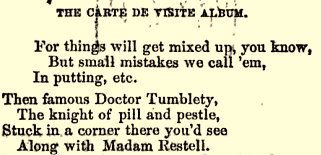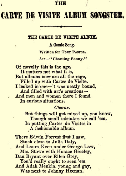 The comic song is called "The Carte de Visite Album" and was written for the singer Tony Pastor to perform on stage. The public enjoyed collecting the portraits of famous people and arranging them in photo-albums. This was a very popular hobby.