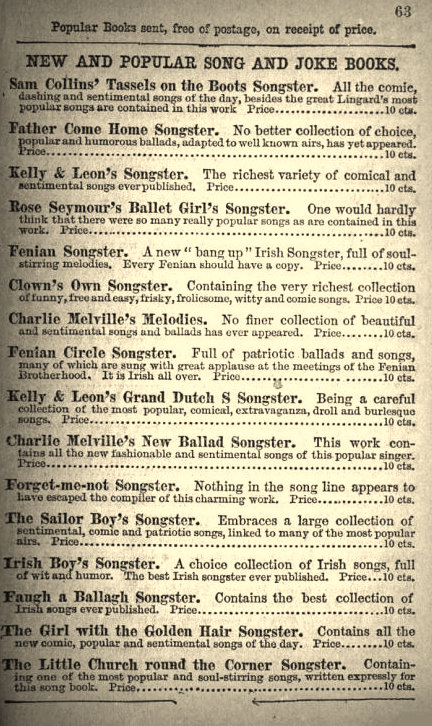 One of the back pages contains an ad for other songbooks, and the 'Fenian Songster' happened to catch my eye. There are 2 Fenian songbooks offered, in fact. New York was of course a major Irish immigration point, and the Fenians received a great deal of their support from Irish-Americans.