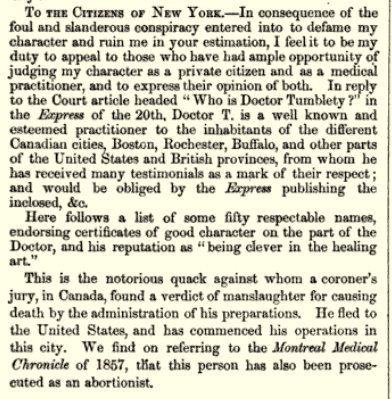 You should read Tim Riordan’s excellent book Prince of Quacks The Notorious Life of Dr. Francis Tumblety, Charlatan and Jack the Ripper Suspect if you want an in depth look at Tumblety’s time in Toronto. Failing that you should read On The Trail Of Tumblety? Inspector Andrews’ Trip To Toronto parts 1 & 2 which appeared in Ripper Notes No. 23 and 24.
