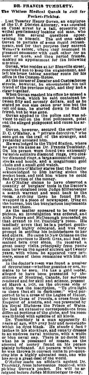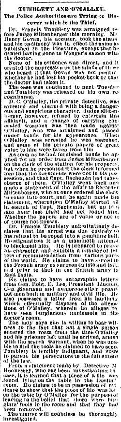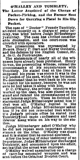 The case involved a young customhouse worker who said that he met Tumblety on the street and had a "pleasant commune" with him at a local bar. They ran into each other the next day, and when the young man got to work, he was missing his wallet. He complained to police, but it was a private detective who arrested Tumblety. Tumblety did go to trial and was aquitted. Instead, the private detective who arrested him was jailed for carrying a concealed weapon! I have copies of several newspaper articles describing the whole incident and trial, but they are in pdf form and I've no idea how to post them here.