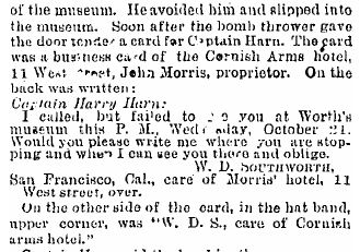 "A man came to my house Sunday evening [December 2]," Roberts told the reporter, "and gave the name of Dr. Tomanly. He said he came on the French Line steamer Bretagne. This morning he came downstairs and said that he had concluded to go out of town. I did not think anything of his going at the time until I read the evening papers that such a man was being sought after, and then the thought struck me that perhaps he was the doctor who has been suspected of being the Whitechapel fiend."