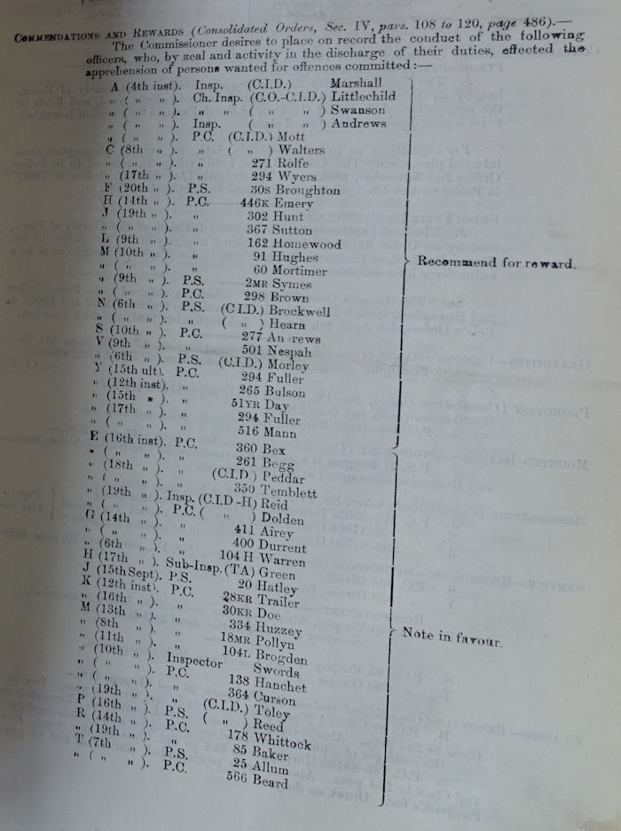 Having awarded myself a short extension, I have now finished my research into the subject of commendations and rewards and will post my results soon. In the meantime, I want everyone to be able to see the entirety of the section on Commendations and Rewards in the 27 Nov 1888 P.O. in order to appreciate the two segments of "Recommended for reward" and "Note in favour".