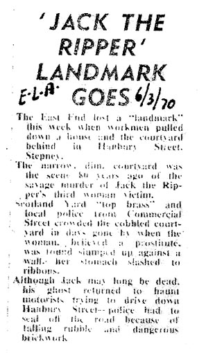 The East End lost a “landmark” this week when workmen pulled down a house and the courtyard behind in Hanbury Street, Stepney. The narrow, dim courtyard was the scene 80 years ago of the savage murder of Jack the Ripper’s third woman victim.