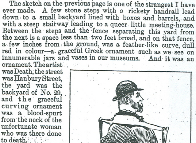 "On the back wall of the house, between the steps and the palings, on the left side, about 18in from the ground, there were about six patches of blood, varying in size from a sixpenny piece to a small point, and on the wooden fence there were smears of blood, corresponding to where the head of the deceased laid, and immediately above the part where the blood had mainly flowed from the neck, which was well clotted."