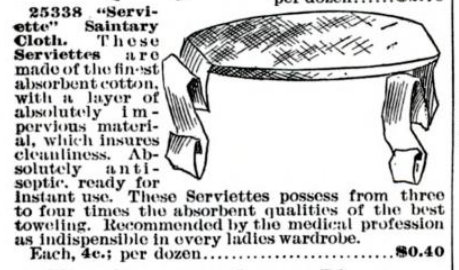 The second illustration is a late 1890's disposable sanitary napkin. ("Serviette" is French for "napkin".)