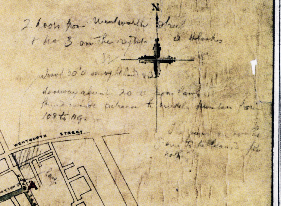 Looks like -2 doors from wentworth street-the 3 on the right-about 30 feet away-that side doorway-about 20 degrees from pane 5-found inside entrance to window numbers from 103(108) to 119.