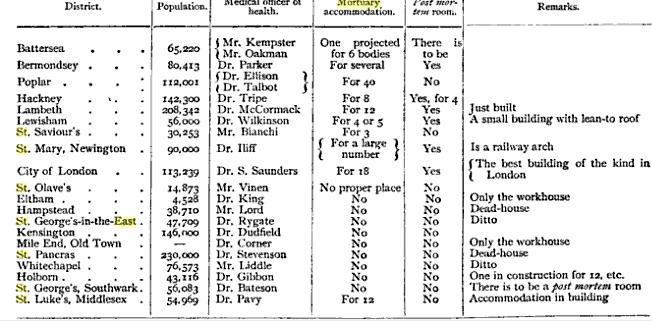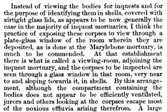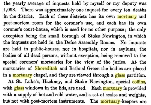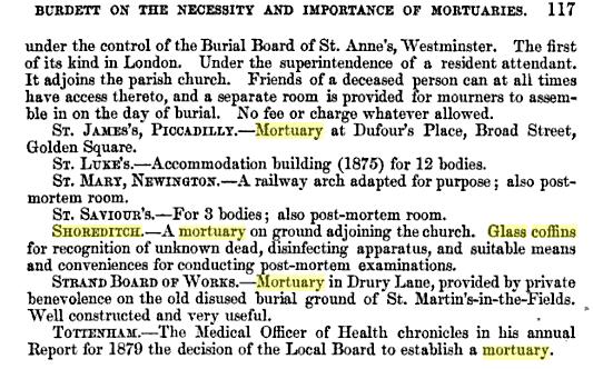 Shoreditch - A mortuary on grounds adjoing the church. Glass coffins for recognition of unknown dead. Disinfecting apparatus, and suitable means and convenience for conducting post mortem examinations