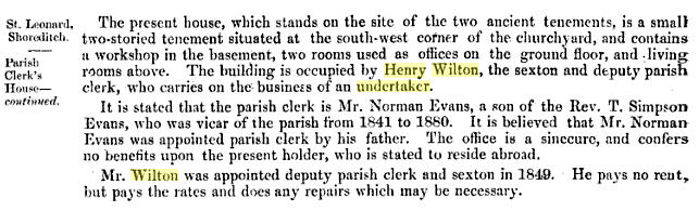 The clerk and mortuary keeper was Henry Wilton, who paid the Kelly funeral expenses. In the 1881 census he is listed as an undertaker at 118 1/2 Shoreditch High Street, age 60, widowed, living with his two sons Charles, 31 and Henry, 23 both cabinet makers. Septimus Buss was the vicar.