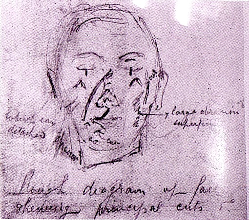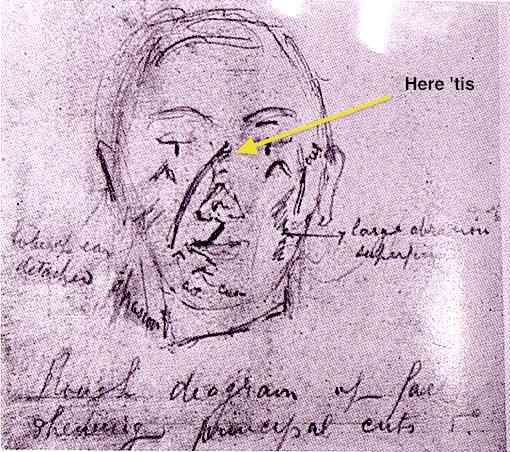 In the interests of common sense could you please point out on the photograph the "deep cut over the bridge of the nose extending from the left border of the nasal bone down near to the angle of the jaw on the right side, across the cheek... you can't miss it"