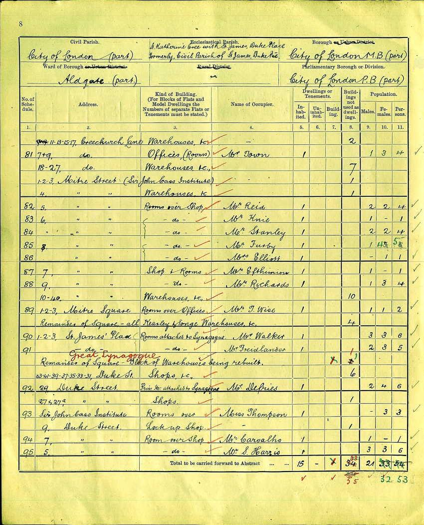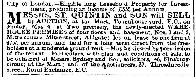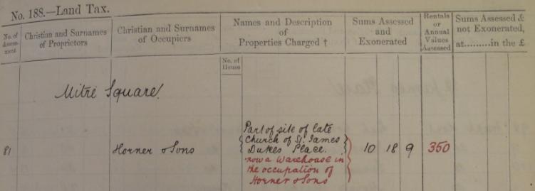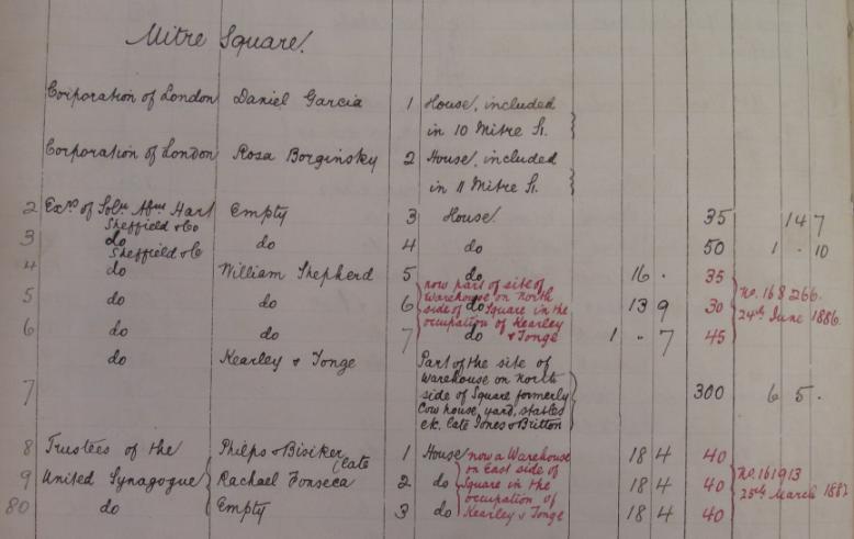 I'm not sure whether this will be of any use to anyone, but I was looking through some City of London land tax assessments, and thought I might as well take a picture of the one for Mitre Square. This is for "the year 1888, ending 24th March 1889" [LMA MS 11316/478].