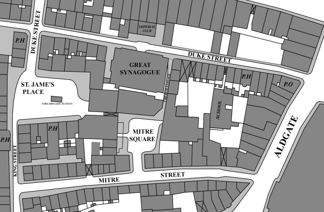 Joseph Hyam Levy 1 Hutchinson Street, Aldgate, Butcher, being sworn saith - "I was with the last Witness and Harris at the Imperial Club in Duke Street. We got up to go home at 1/2 past one. We came out about 3 or 4 minutes after the half hour. I saw a man and woman standing at the corner of Church Passage. I passed on taking no further notice of them. The man I should say was about 3 inches taller than the woman. I cannot give any description of either of them. We went down Duke Street into Aldgate leaving the man and woman still talking behind. I fix the time by the Club clock. I said when I came out to Mr. Harris, "Look there, I don't like going home by myself when I see those characters about."