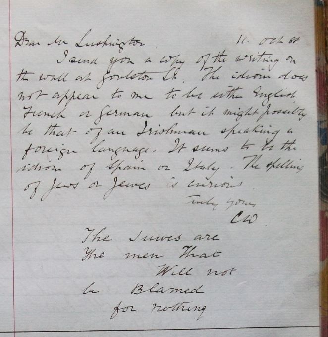 After suggesting the idiom might "be that of an Irishman speaking a foreign language", or that of "Spain or Italy", Warren states that "The spelling of 'Jews' or 'Jewes' is curious."