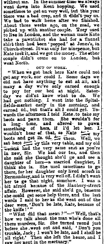 "In the summer time we always went down into Kent hopping. We used sometimes to get on very well, but this year there was a bad crop, and it didn't pay us. We had to walk home after we finished. About three weeks ago, on the road, we picked up with another couple. They used to live in London, and the woman made Kate take a pawnticket she had for a flannel shirt that had been 'popped' at Jones's, in Church-street. It was only for ninepence, but Kate took it, and we got the money. The other couple didn't come on to London, but went North."