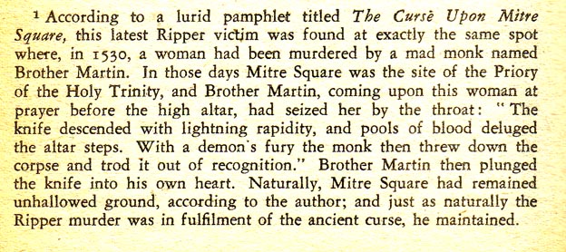 For those who missed Monty's post or who are confused about what "penny dreadfuls" are (especially as a few posters here in the past have purposefully tried to present them as actual historical records so that the contents of some could be used to support their own theories), The Curse Upon Mitre Square is a work of fiction. The murdering monk in it has not been shown to have been an actual historical person. Considering that the *only* evidence for his existence is a book that is undeniably nothing but a rather over the top melodrama in which the ghost of this monk was said to go around killing people, you should assume that it was made up for the purposes of the story.