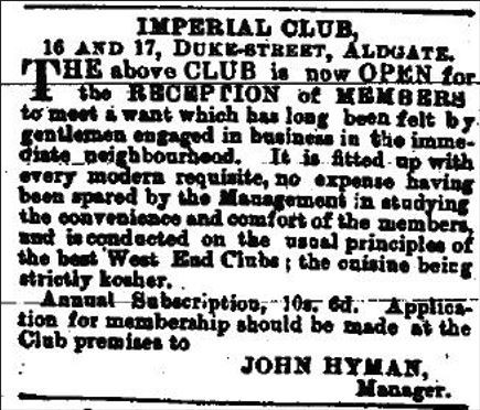 Imperial Club sounds like a groovy place - with aspirations, hence the name.Originally posted by Simon Wood View PostJewish Chronicle, 18th March 1887.